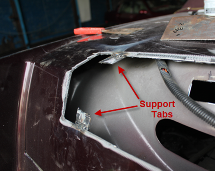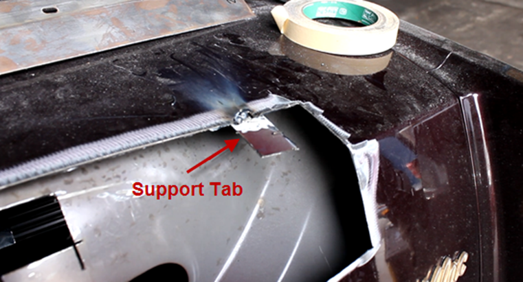 The picture below shows the 2 support tabs on the left side of the trunk lid. If you cut everything out correctly then the bracket should have clearance all the way around the cut out and it has the possibility of falling into the cut out. Tabs will help keep it in place while you are welding.\