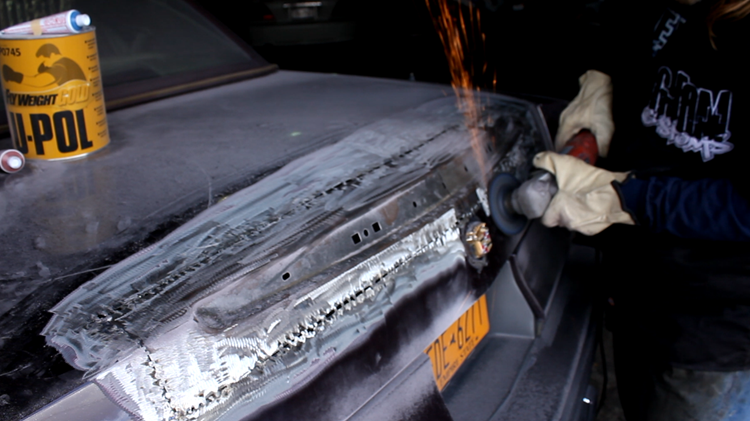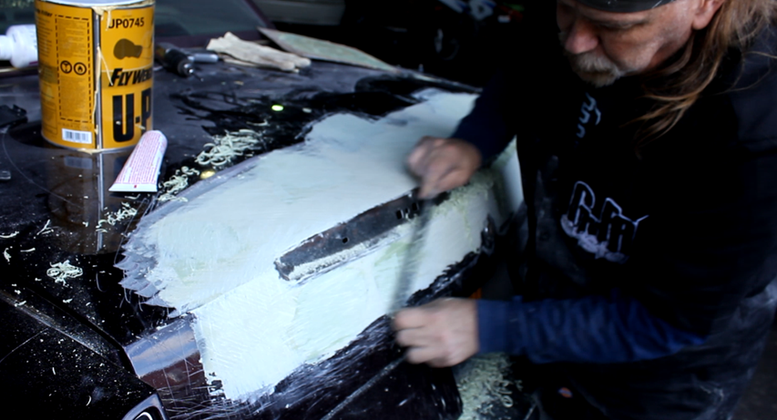 The next step is to bodywork. Use body filler, after it dries, sand it smooth.