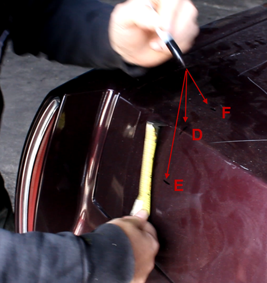c. Tape the bottom part of the trunk lid, in the last step you measured 2-3/4″ from the trunk edge -> down on the left and the right side. The tape connecting the 2 marks on this should slope down in the center. You have to look at the bracket and eye this taping.