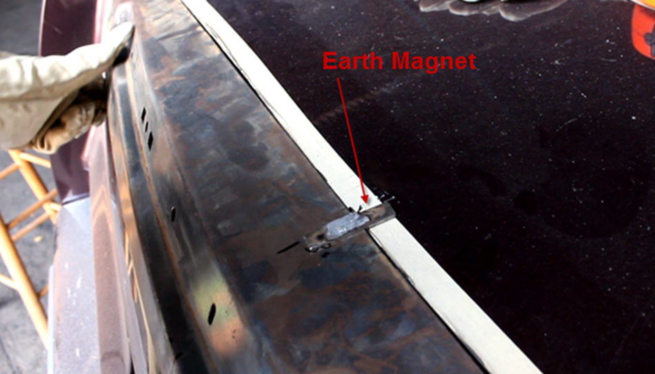 This step is optional but we recommend it. We welded on 6 pieces of metal (small tabs cut out of the larger piece we just cut out). 3 on the top and 3 on the bottom at left, right and center. With these tabs in place and the earth magnet holding the bracket steady, welding on the bracket will be a lot easier.